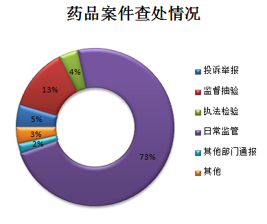 图3-1-2全省药品经营企业日常监管情况 二、药品案件查处情况2018年一季度,各级监管机构共查处违法药品案件总数1452件,其中一般程序案件966件,简易程序案件486件,货值金额655.75万元,罚款金额498.71万元,没收违法所得金额189.2万元;取缔无证经营1户,捣毁制假售假窝点1个,责令停产停业17户,吊销经营许可证3件,移送司法机关案件数24件,行政处罚案件信息公开数665件,符合公开条件的行政处罚案件671件。 从案件来源看,投诉举报67件,监督抽验188件,执法检验57件,日常监管和专项检查1062件,其他部门通报28件,其他50件。 从货值来看,5万元以下的案件1445件,5万元以上的案件7件。