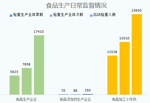 (二)食品日常监管情况1、食品生产环节日常监管情况 2018年一季度,全省日常监管工作中,共检查食品生产企业5623家、食品添加剂生产企业70家、食品加工小作坊11518家。出动检查人员41253人次,其中食品生产企业17410人次,食品添加剂生产企业193人次,食品加工小作坊23650人次。快检生产主体数1016家次,其中食品生产企业487家次,快检食品加工小作坊529家次;快检食品批次数2571批次,其中食品生产企业1640批次,快检食品加工小作坊931批次;快检不合格食品批次数79批次,其中食品生产企业36批次,快检食品加工小作坊43批次。