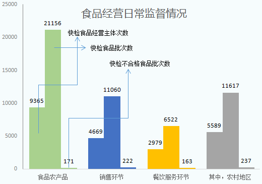 日常监督检查中发现违法违规的生产主体数1002家次,其中食品生产企业302家次,食品添加剂生产企业7家次,食品加工小作坊693家次;发现违法违规问题数1927个,其中食品生产企业539个,食品添加剂生产企业20个,食品加工小作坊1368个;完成整改生产主体数1391家次,其中食品生产企业482家次,食品添加剂生产企业7家次,食品加工小作坊902家次。详见附表2。 2、食品经营环节日常监管情况 2018年一季度,全省共检查销售环节食品经营主体128698家次,检查餐饮服务环节133390家次,共计262088家次,其中农村地区73257家次。销售环节共出动检查人员124865人次,餐饮服务环节132825人次,共计257690家次,其中农村地区69772人次。快检食品经营主体次数17013 家次,其中食用农产品9365家次,销售环节4669家次,餐饮服务环节2979家次; 快检食品批次数38738批次,其中食用农产品21156批次,销售环节11060批次,餐饮服务环节6522批次;快检不合格食品批次数556批次,其中食用农产品171批次,销售环节222批次,餐饮服务环节163批次。发现违法违规的经营主体数3958家次,其中非法添加非食用物质43家次,超范围和超限量使用食品添加剂188家次;发现违法违规的问题数6074个,完成整改经营主体数5492家次。“明厨亮灶”实施户数71130户,量化分级评定总数276604户,其中优秀4538户,良好95789户,一般176277户。详见附表3.
