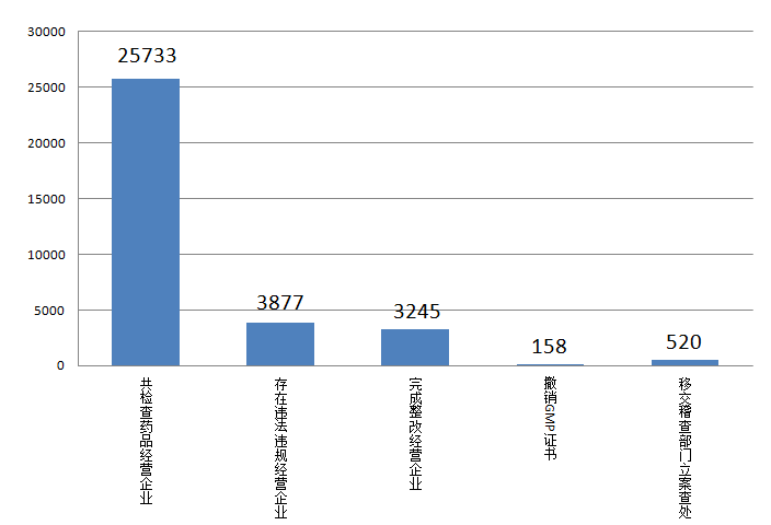图3-1-1 全省药品生产企业日常监管情况 (三)药品经营企业日常监管情况2018年三季度,全省共检查药品经营企业25733家次,其中批发企业1306家次,零售企业24427家次;存在违法违规的经营企业3877家次,其中批发企业204家次,零售企业3673家次;完成整改的经营企业3245家次,其中批发经营企业175家次,零售企业3070家次;撤销GSP证书158张,其中批发经营企业12张,零售企业146张;移交稽查部门立案查处520件,其中批发企业30件,零售企业490件。详见附表7。